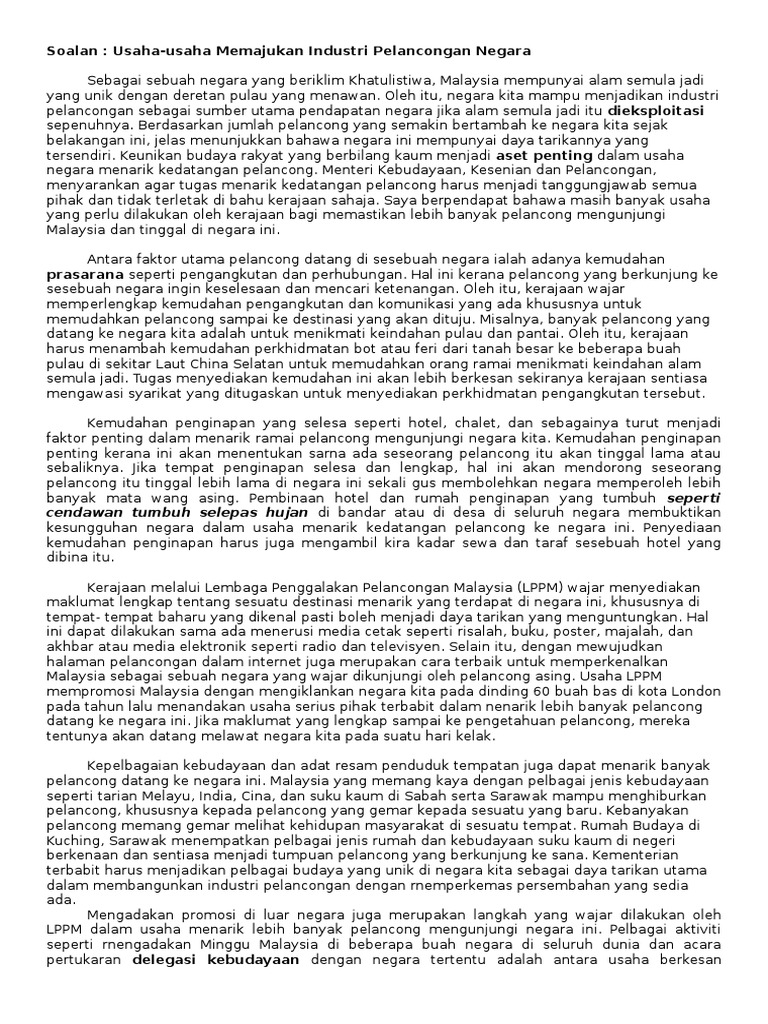 Semoga dengan perkongsian ini sedikit sebanyak dapat membantu anda dalam menghasilkan karangan yang berkualiti. Oxford English Dictionary mendefinisikan pelancongan adalah orang yang membuat lawatan atau kunjungan pada masa kelapangan Honey 1999. Menteri Pelancongan Seni dan Budaya MOTAC Datuk Seri Nancy Shukri berkata dengan pembukaan domestik secara berperingkat ia bakal memberi sinar kepada penggiat industri di negara ini.